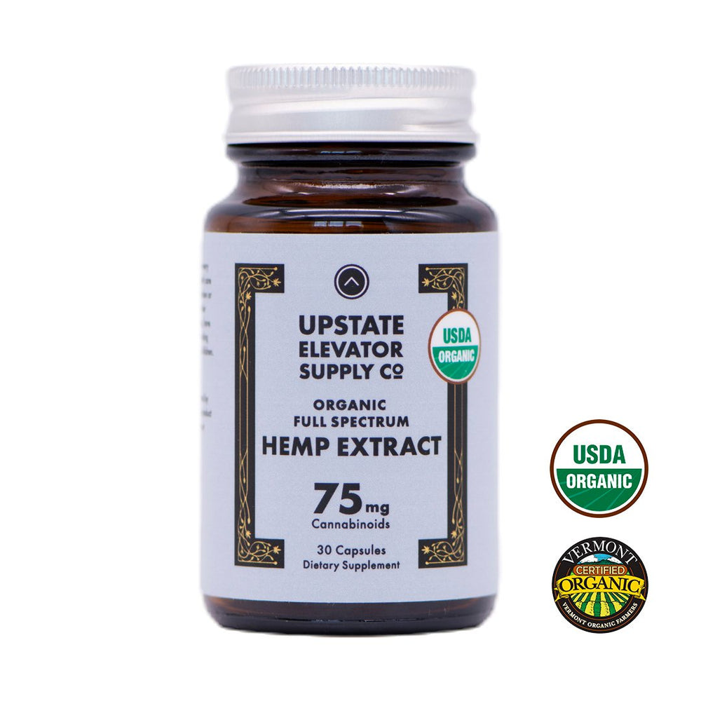 Upstate’s 75mg Organic Full Spectrum CBD capsules are among the strongest organic CBD capsules available anywhere. These simple and potent hemp oil capsules are proudly made from USDA certified organic