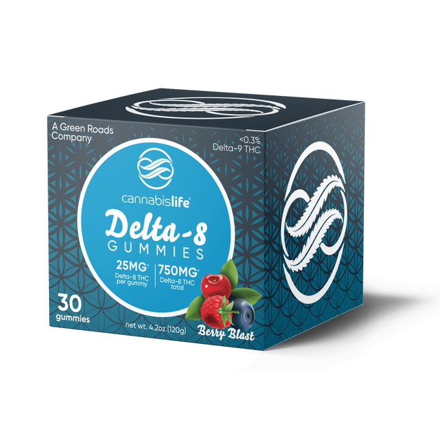 A 30-count jar of Cannabis Life’s Berry Blast Delta-8 THC gummies. Each gummy delivers juicy mixed berry flavor and that deeply relaxing feeling that only Delta-8 can bring.