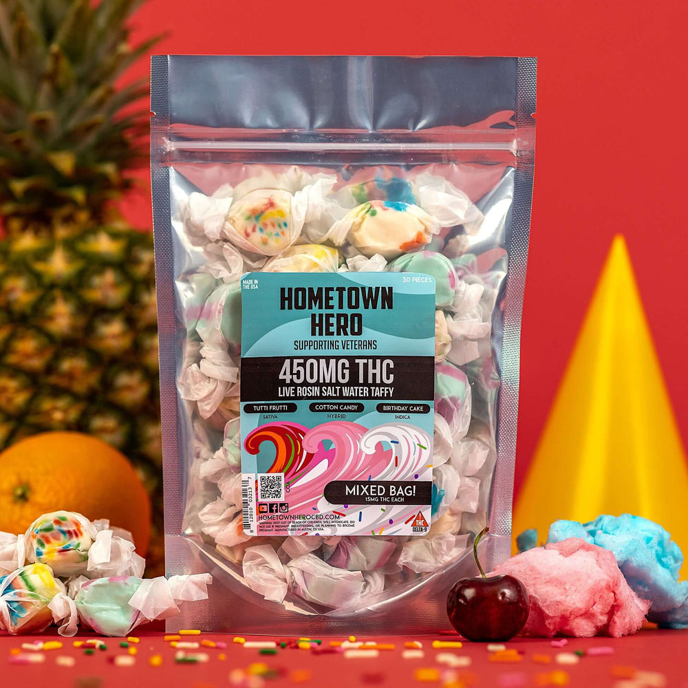 - Ocean waves and carnival games are a bite away with these boardwalk classics. Get Hybrid Cotton Candy, Indica Birthday Cake, and Sativa Tutti Frutti in one bag at 15mg of hemp-derived THC per piece.