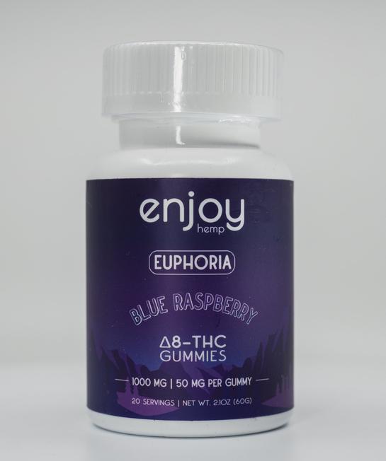 - ENJOY RELIEF with our Delta-8 THC gummies. Enjoy Hemp offers three flavors of Δ8 THC Gummies; Blue Raspberry, PineApple and Strawberry. Each container consists of Twenty 50mg Δ8 gummies combining for a total of 1000mg per pack. Offering the most potent and all-natural Delta-8 THC experience on the market with the only Vegan, All-Natural, and Gluten-Free Delta-8 THC Gummy...